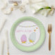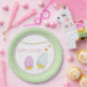 NewParkLane - Platos de papel de Pascua, con dos lindas chicas de Pascua recién cortadas de sus cáscaras de huevo en rosa pastel y morado y una en azul suave. Con dos coquetas mariposas naranjas y una bandera de colores pastel. Un marco con un borde rosa sobre un fondo polkadot verde pastel y blanco. Fácil de personalizar en Zazzle con su propio texto para un diseño personalizado. Todos los estilos, colores y tamaños de texto se pueden modificar para adaptarlos a sus necesidades. Proteja esta colección para ver los elementos coincidentes.