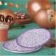 Este diseño tiene un patrón de número aleatorio morado con el número de edad 30 repetido en diferentes tamaños y ángulos para una impresión general. El diseño está recortado con anillos morados y blancos alrededor del borde.