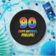 Este alegre, divertido y colorido diseño de placas de papel de cumpleaños incluye un gran número "90" y el mensaje "FELIZ CUMPLEAÑOS", ambos con un colorante inspirado en el gradiente del espectro del arcoiris, junto con un nombre personalizado amarillo en negrita. El fondo es negro de color. Las placas de papel con temática de cumpleaños como esta podrían ser usadas para celebrar el cumpleaños 90 de alguien. [~Z0000488]