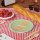 Placa de papel con una sonriente cantaloupe y una edad de cumpleaños. La edad puede ser personalizada.