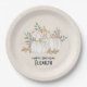 Platos de papel de cumpleaños con lujosas calabazas blancas acuarelas con acentos de falso purpurina de oro. Rodeado de hojas verdes y flores silvestres rosas.