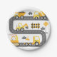 Fiesta de cumpleaños de camión de construcción con camión de volcado, grúa, carteles de advertencia y conos de naranja.