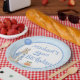 Plato de papel personalizado para la fiesta de cumpleaños del conejo azul lindo con tortas de zanahoria y globos. Tema de la fiesta de segundo cumpleaños. Marco de cuadros azul y blanco con gráfico de pastel de zanahoria. Personalice con su elección de nombre. Perfecto para la fiesta de cumpleaños del conejo más dulce.