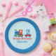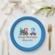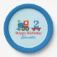 ¡Trae tu fiesta de cumpleaños del tren al siguiente nivel con platos personalizados! Las placas azules de papel personalizado presentan un lindo motor de tren que tira de un cuidado con un número. Cambie el número para que coincida con la edad del niño de cumpleaños. El plato dice Feliz Cumpleaños y también tiene un lugar para el nombre del niño. Todo el texto se puede personalizar con palabras, fuentes y colores cambiados o eliminados.