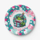 Cuidados platos de papel personalizados para fiestas de cumpleaños para el cumpleaños de una niña. Una adorable rana en un gorra de cumpleaños sosteniendo un regalo con un lindo fondo de punto de polka en rosa y verde azulado. Añadir nombre en el área personalizada.