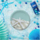 Placas de papel con temática marina y diseño de estrella de mar e hidrangea. Azul con estrella de mar blanco y flor y sin texto, estos platos vienen en dos tamaños. Utilícelo para una fiesta de cumpleaños o cualquier tipo de celebración con un tema de playa.
