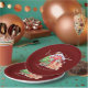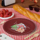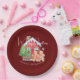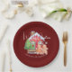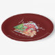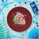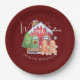 Este plato de fiesta para Navidades personalizados presenta un bonito ilustracion acuático de gente con pan de jengibre. Un pequeño hombre de pan de jengibre está parado frente a su casa de pan de jengibre. A la izquierda hay un árbol decorado con bonito. El fondo es un color burdeos rico.