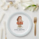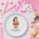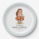 El diseño de los alegres platos de papel para la ducha de bebé presenta un adorable erizo sentado en un caprichoso hongo, sosteniendo un ramo de flores en un encantador ilustracion acuarela.