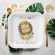 Acuarela Adorable Cute pequeño rey de león bebé vestido con una corona de oro y rodeado de verde vegetación fresca hojas de la selva tropical de la selva que decoran el fondo. Son placas de papel para bebé. ¡Un rey de la jungla está en camino! Puede personalizar estas placas de papel dulce añadiendo su propio texto personalizado.
