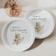These cute baby shower paper plates feature a watercolor teddy bear dressed as an astronaut, riding on a rocket ship, below the words "baby shower" in blue-green hand printing. Personalize the text with the name of the mom-to-be and date in charcoal gray sans serif font.