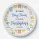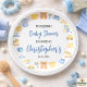 Cute boy baby shower paper plates with baby clothes and toys theme. Perfect tableware for baby boy shower party decorations.
