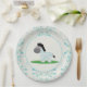 Celebra tu próxima llegada con estos platos de papel fiesta. Este diseño presenta una cebra de bebé azul con un fondo decorativo floral de colores verde azulados y azul claro.