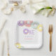 Cute and sweet kids birthday party paper plates featuring watercolor donuts and colorful sprinkle with number 'One' in a large bold serif font. All text can be personalized.