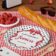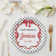 Elegant red bow and ribbon with polka dot background, birthday paper plate, change the text to anything you want when ordering