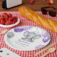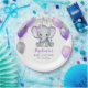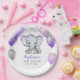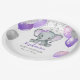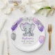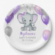 Estas adorables placas de papel para bebés cuentan con elefante de bebé morado y gris con globos y confeti. Fácilmente personalizado para su evento haciendo clic en "Personalizar".