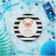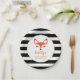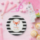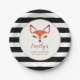 Estos modernos y dulces platos de papel para bebés presentan una cara de zorro rojo-naranja adorable con pestañas negras, nariz y puntas para los oídos. El nombre de personalizable de la futura mamá aparece en la letra de escritura a mano de color rojo naranja. Más allá del falso marco circular de oro se encuentra un fondo de rayas blancas y negras. Ideal para una ducha de bebé con temática de zorro o de bosque.