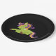 Placas de papel con una imagen de un unicornio Frankenstein. Colores púrpura y verde. Qué lindo.