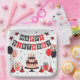Cute happy birthday ladybug theme. Red, black and white design with balloons, paper hats, gift boxes and cake.