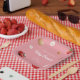 Placas de papel de ducha para bebés con adorables insectos de amor, quequitos, flores y ilustraciones de fresa, todo ello en un esquema de color rojo, blanco y marrón claro. Junto con los ilustraciones hay una letra de guión lúdica y un elegante sans serif en el que se escribe toda la información personalizada. Visita nuestra tienda para ver más artículos de esta colección.