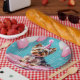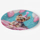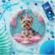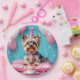 This birthday party paper plate has a c cute Yorkie with a pink birthday hat, a cupcake and some diamond and balloons bling.