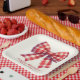 These cute paper party plates feature a large red and cream gingham plaid bow. Personalize with your choice of special text. Great for any occasion.