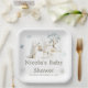 Rústico plato de papel para bebés con lobos adorables, un tronco cubierto de nieve, un árbol y copos de nieve. Perfecto para una ducha de bebé de invierno. Las palabras se pueden cambiar para adaptarlas a sus propios detalles o requisitos