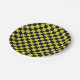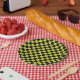 Yellow and black checkerboard pattern with alternating squares. The bold contrast creates a striking, geometric visual effect.