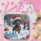 Un juguetón Dachshund recorre la nevada escena del invierno, usando un gorra festivo de Navidades rojos. Este encantador diseño destaca el cuerpo largo de la raza, las piernas cortas y la personalidad animada mientras captura el calor y la alegría de la temporada de vacaciones. Un momento de invierno delicioso lleno de alegría festiva.