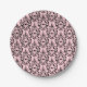 Este diseño de placa fiesta presenta una araña sobre un fondo de damasco negro y rosa.