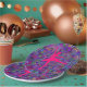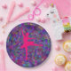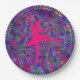 Diseño de danza por la paz con una bailarina rosa caliente en el centro rodeada de signos de paz multicolores.