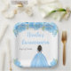 This Quinceanera plate features faux glitter bright blue floral flowers and a beautiful princess with dark skin and an elegant dress. This is perfect for a Quinceanera birthday party.