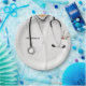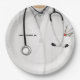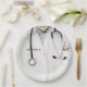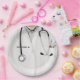 Diseño único con tema médico que incluye bata de laboratorio de médico, estetoscopio y navaja suiza. Edite el texto para agregar el nombre del médico.