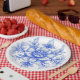 Hermosa ilustración floral azul y blanca de inspiración asiática para una vajilla elegante.