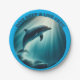 Un delfín bajo el agua con rayos de luz solar filtrándose a través del agua. Las palabras 'bucear profundo, vivir libre' están escritas encima de la imagen. Un maravilloso plato de papel con un mensaje inspirador. Contiene contenido generativo.
