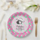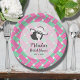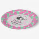 ¡Y se va al altar! Una dama con su sombrero Derby sobre un fondo de rosa intenso, verde y blanco de bloques diagonales de rayas en platos de papel de 2 tamaños. Divertido para la despedida de soltera con tema Derby de su futura novia. Utilice para cualquier ocasión, solo cambie el texto. (La imagen de la dama se puede eliminar, así como todo el texto y el círculo blanco.) Artículos COINCIDENTES en nuestra tienda.
