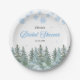 Platos de papel para despedida de soltera con copos de nieve y árboles de pino de invierno nevados.
