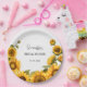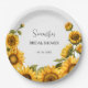 Girasoles amarillos brillantes y hermosas hojas verdes. Despedida de soltera plato de papel minimalista