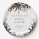 Estas modernas y elegantes platos de papel para despedida de soltera con flores de acuarela y piñas rústicas de bosque pueden ser personalizadas con su información en tipografía azul elegante. Diseñadas por Thisisnotme©