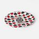 These are cute paper plates for a variety of occasions, but especially card parties. They feature the familiar red, black, and white pattern of diamonds, hearts, spades and clubs commonly found in a deck of playing cards. The center of each plate has a gold frame around the winking Queen of Hearts.