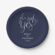 Este elegante guión azul marino "She said yes", placa de papel de la fiesta de compromiso puede ser personalizado con todos tus nombres y fecha especial. Diseñado por Thisisnotme©