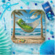 Un gran encurtido verde colgado entre dos palmeras tropicales en una playa con chanclas.