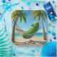 Un gran encurtido verde colgado entre dos palmeras tropicales en una playa con chanclas.