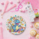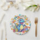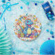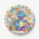 Placa redonda de papel de dinosaurios de cumpleaños feliz, diseñada con globos y dinosaurios coloridos
