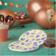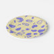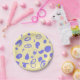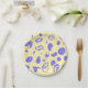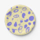 Este plato de papel está lleno de divertidos motivos circulares de lavanda y manchas en un vibrante fondo blanco amarillento.