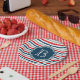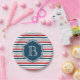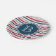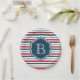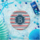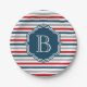 Diseño de temática náutica con decoración monográfica sobre fondo de rayas azules, blancas, rojas y grises