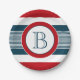 Diseño de temática náutica con decoración monográfica en forma redonda sobre fondo rayado azul, blanco y rojo