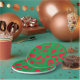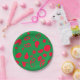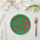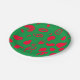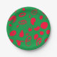 Este plato de papel festivo muestra líneas curvadas y formas en rojo sobre una superficie verde.