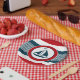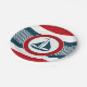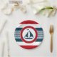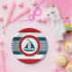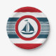 Diseño náutico con decoración de velero en forma redonda sobre fondo rayado azul, rojo y blanco