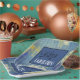 Un divertido diseño retro de cumpleaños número 50. Las palabras "¡Cincuenta y FABULOUS!" fueron creadas con un guión vintage de moda, y enmarcadas con un antiguo patrón de denim azul. También hay otros colores y motivos. ¡Par con suministros y regalos a la fiesta para una fabulosa celebración de 50 años para recordar!