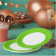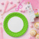 Este diseño festivo y circular presenta un gran círculo blanco central con una banda ancha y colorida de cal verde lima con pequeños puntos de polka blanco.